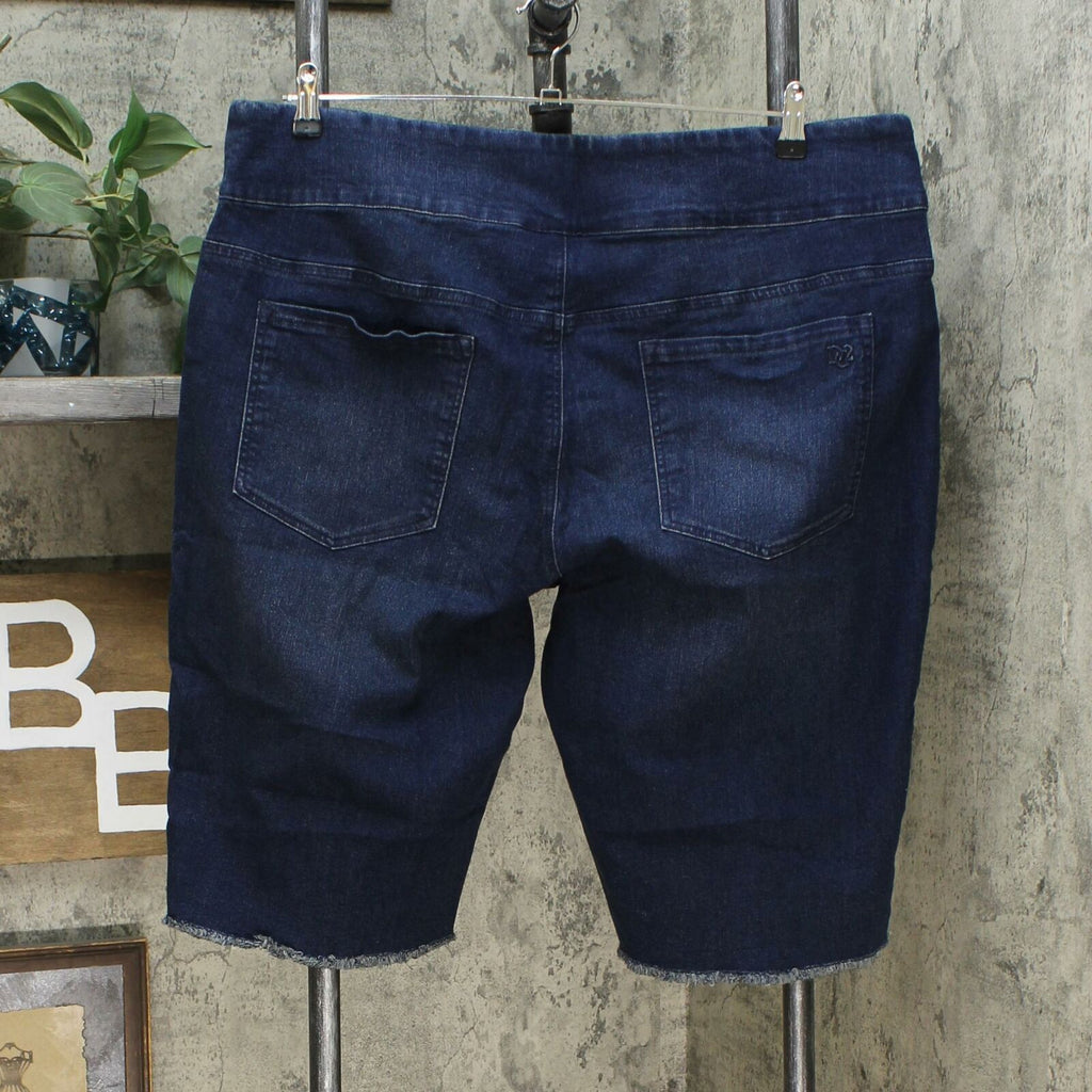 A frayed hem gives these denim Bermuda shorts a cut-off look that's right on trend. But the best part may be the wide, stretch waistband offering all-day comfort.