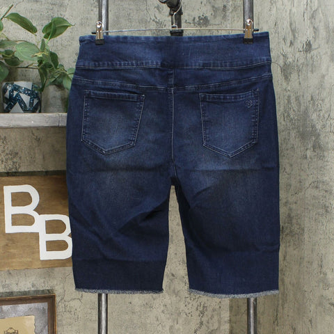 A frayed hem gives these denim Bermuda shorts a cut-off look that's right on trend. But the best part may be the wide, stretch waistband offering all-day comfort.