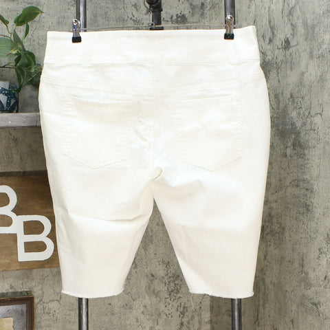 A frayed hem gives these denim Bermuda shorts a cut-off look that's right on trend. But the best part may be the wide, stretch waistband offering all-day comfort.