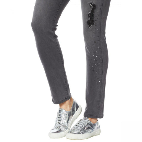 A scattering of stones sparkle in contrast with the strategic destruction of classic stretch denim a luxe juxtaposition that makes these jeans so much fun to wear.