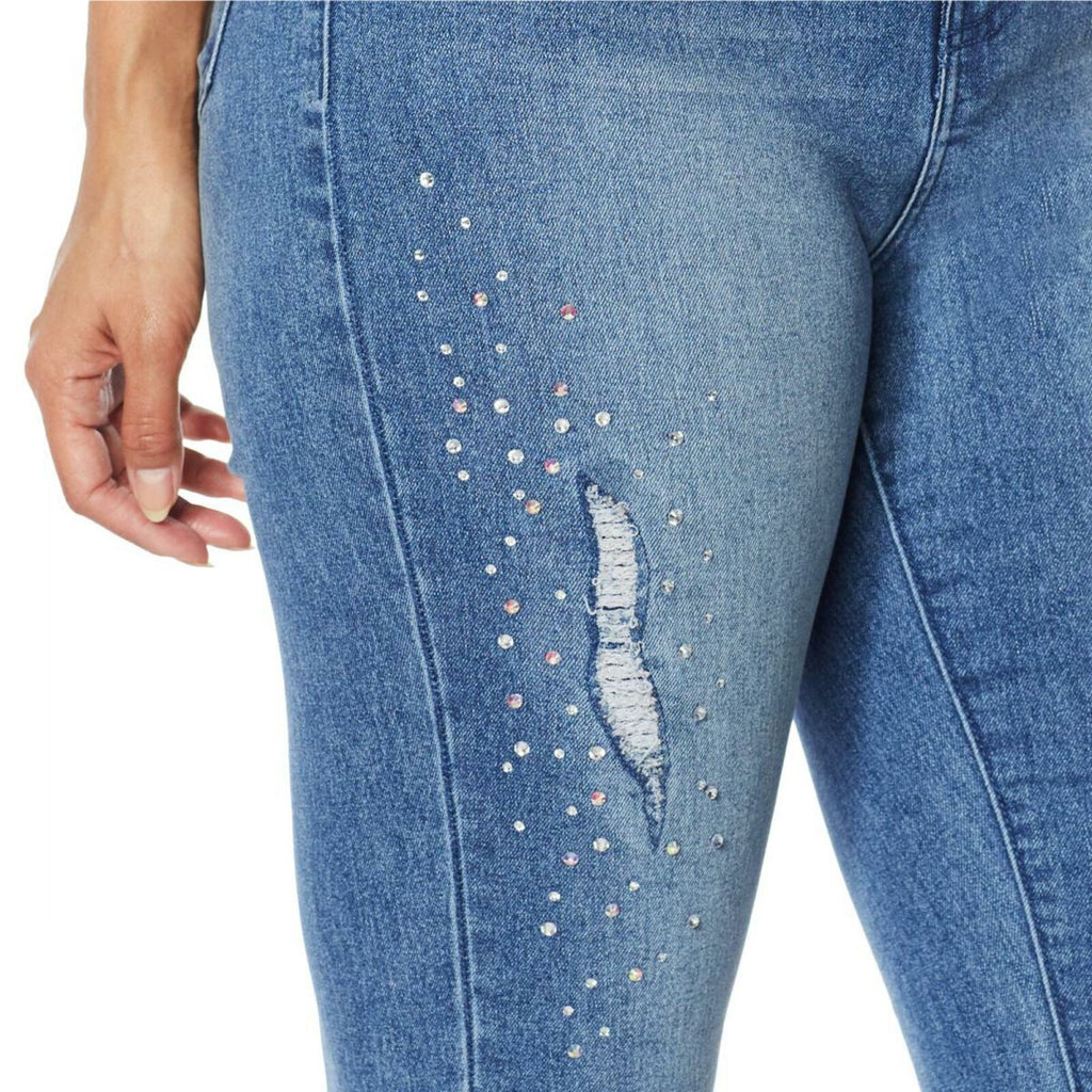 A scattering of stones sparkle in contrast with the strategic destruction of classic stretch denim a luxe juxtaposition that makes these jeans so much fun to wear.
