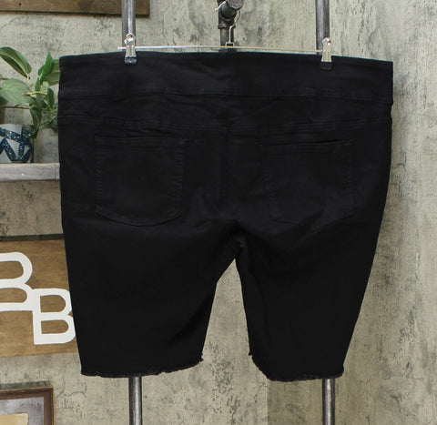 A frayed hem gives these denim Bermuda shorts a cut-off look that's right on trend. But the best part may be the wide, stretch waistband offering all-day comfort.