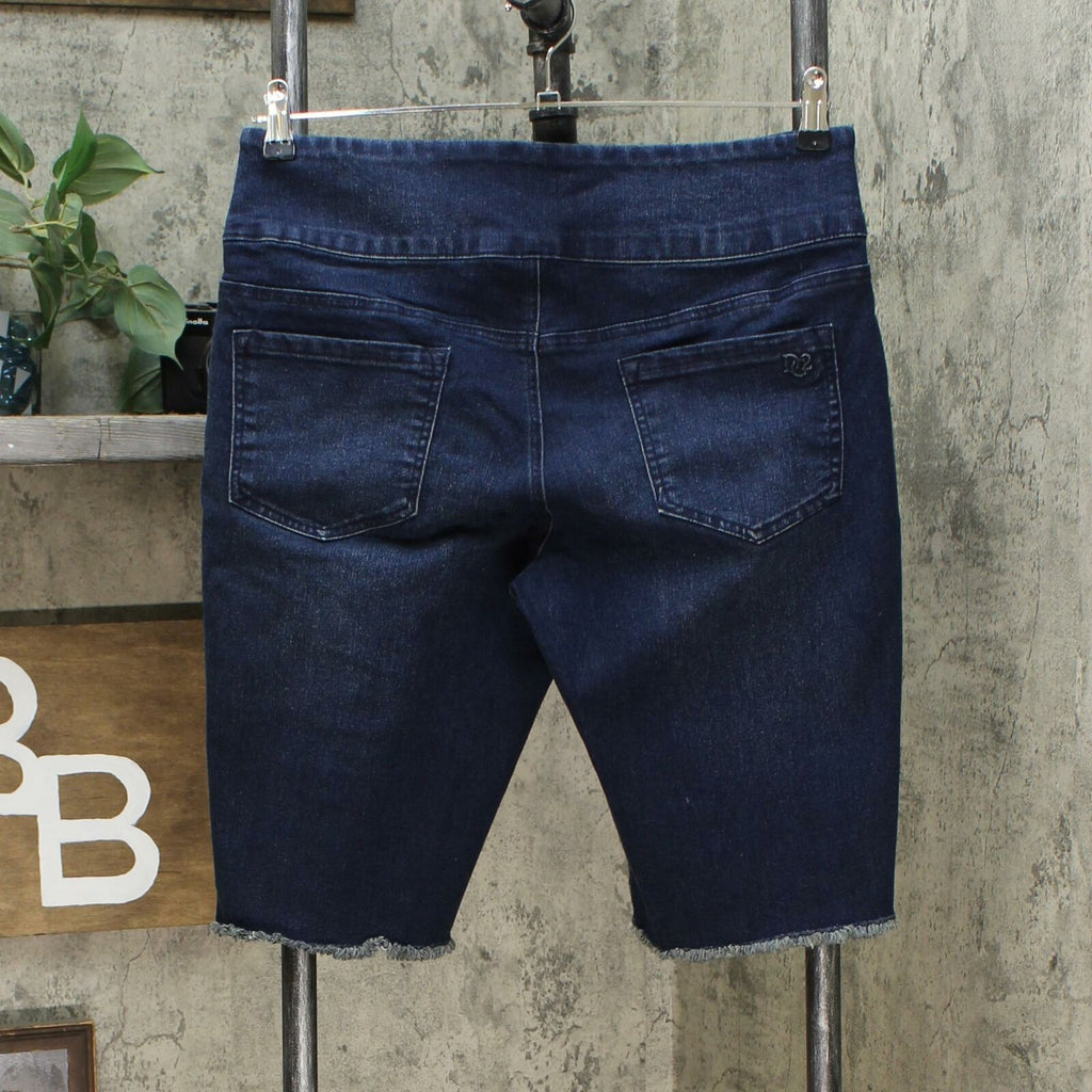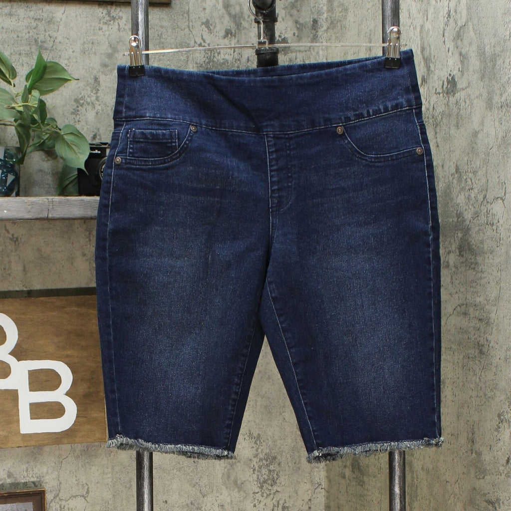 A frayed hem gives these denim Bermuda shorts a cut-off look that's right on trend. But the best part may be the wide, stretch waistband offering all-day comfort.