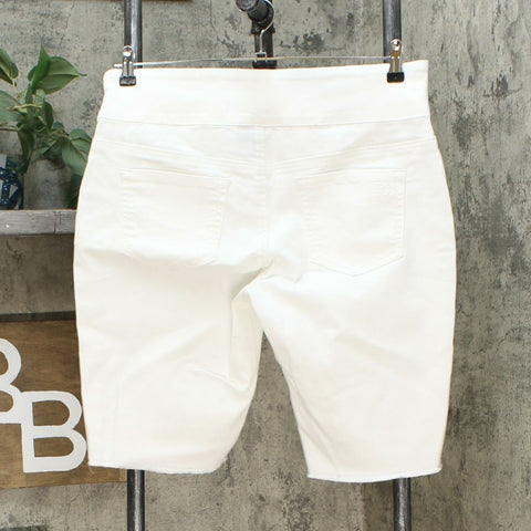 A frayed hem gives these denim Bermuda shorts a cut-off look that's right on trend. But the best part may be the wide, stretch waistband offering all-day comfort.