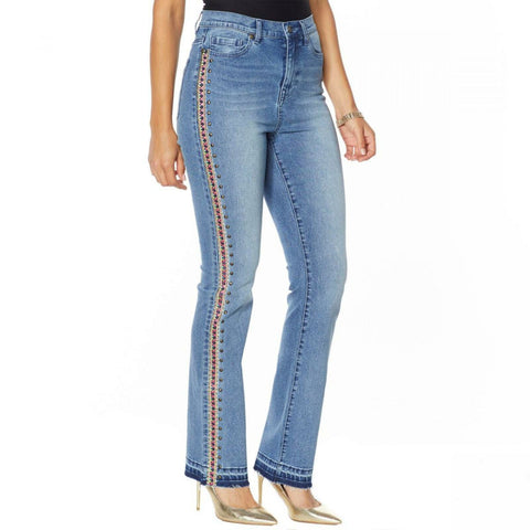 Nothing flatters quite like a boot-cut jean. The slimming, leg-lengthening silhouette looks great on every body type, and we've updated it with embroidered and studded outseams.