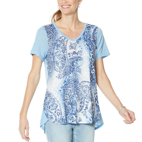 A favorite silhouette, vibrant prints and a splash of sparkle make this lightweight top one you'll want to own in several colors.