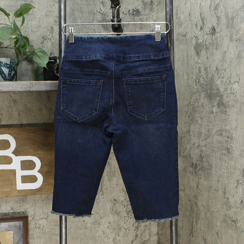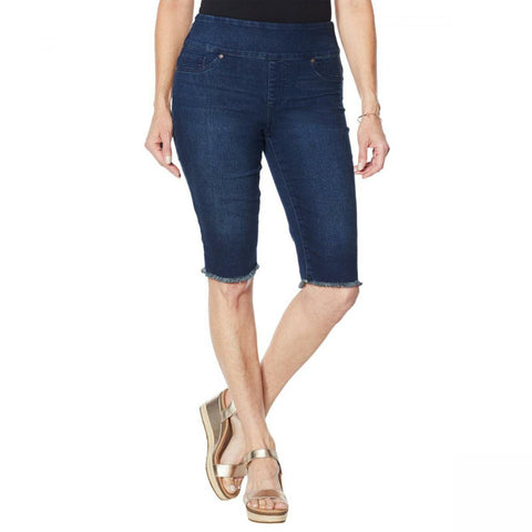 A frayed hem gives these denim Bermuda shorts a cut-off look that's right on trend. But the best part may be the wide, stretch waistband offering all-day comfort.
