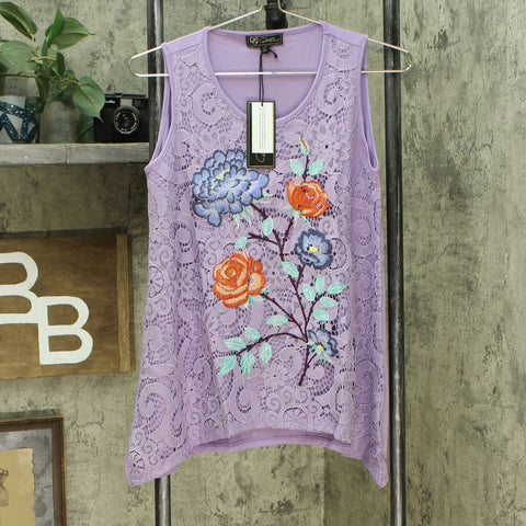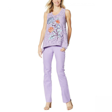 Worn alone or layered under a jacket, our updated tank from Diane Gilman features soft jersey knit and a tonal lace overlay that looks perfect with slacks and a blazer now and jeans and high heels later.