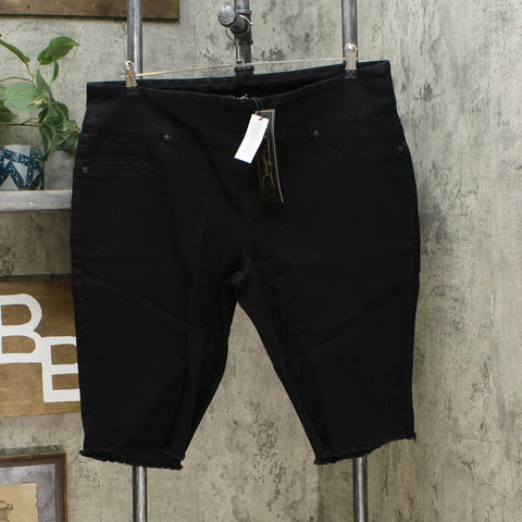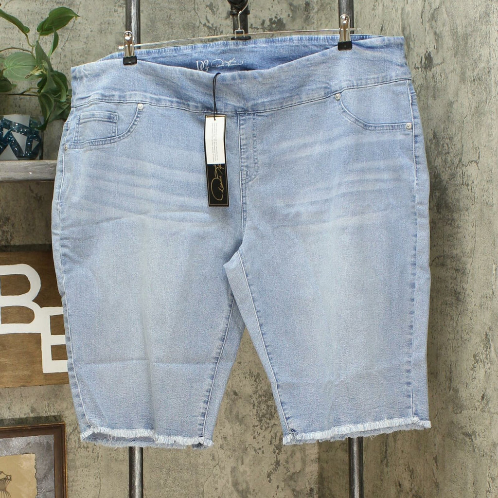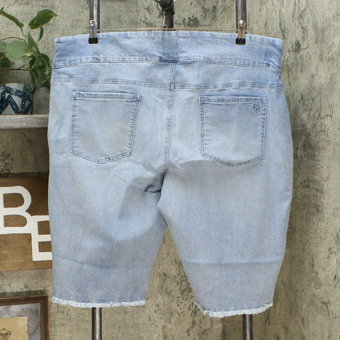 A frayed hem gives these denim Bermuda shorts a cut-off look that's right on trend. But the best part may be the wide, stretch waistband offering all-day comfort.
