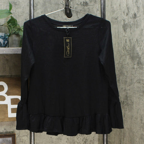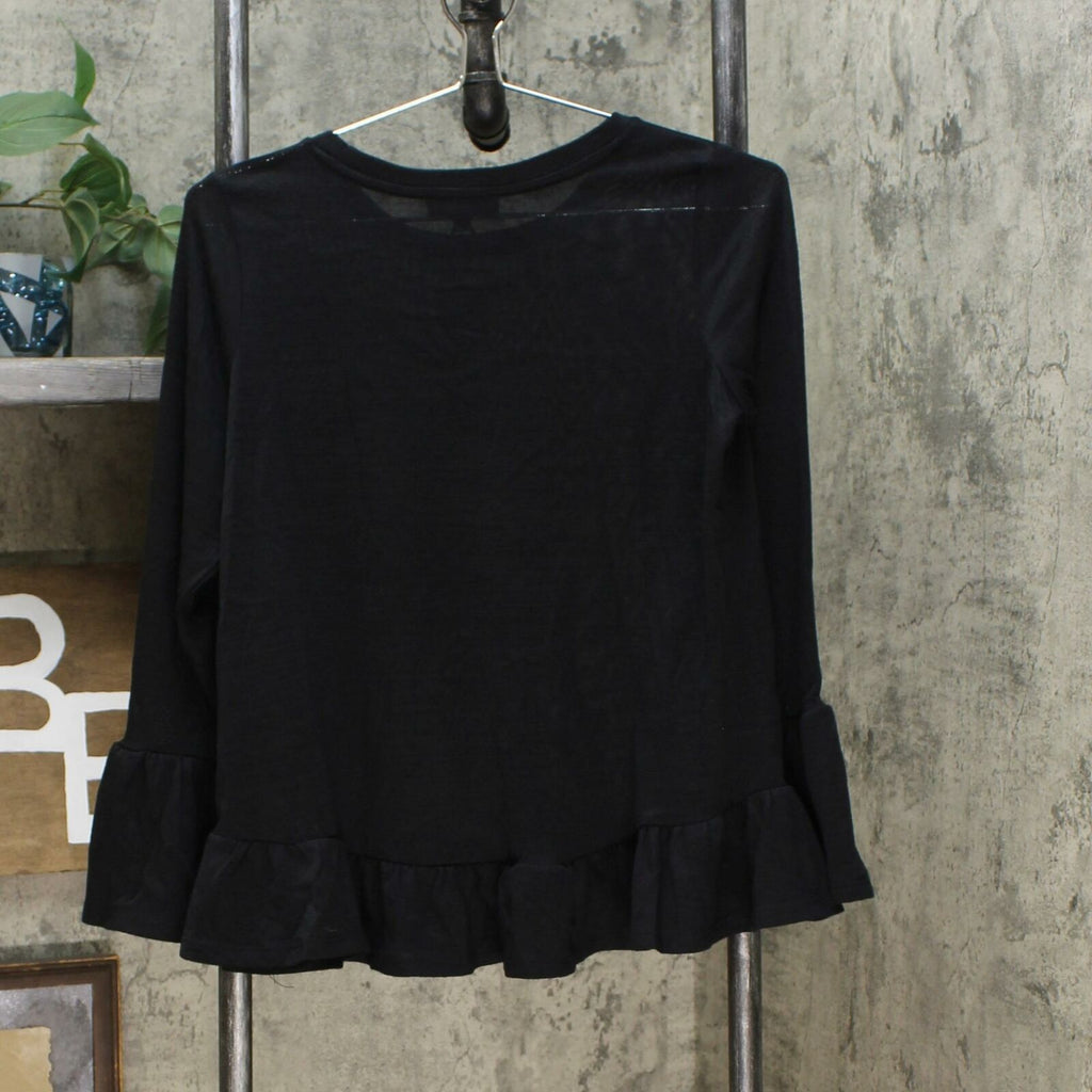 A wide ruffle dances at the sweep and cuffs of this superlatively soft pullover. The lightweight fabrication means you can wear it pretty much year round.