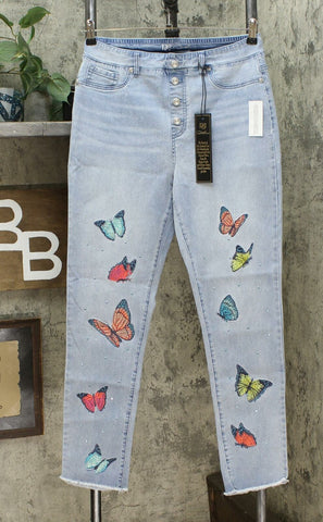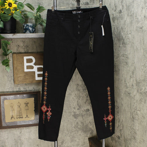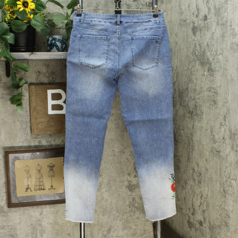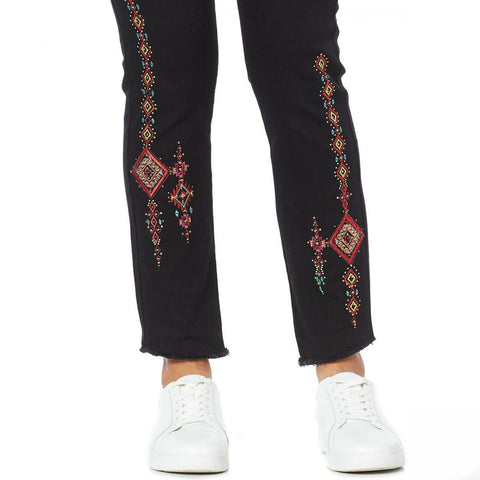 Colorful embroidery jazzes up comfortable pull-on jeans featuring a faux button fly for ease.