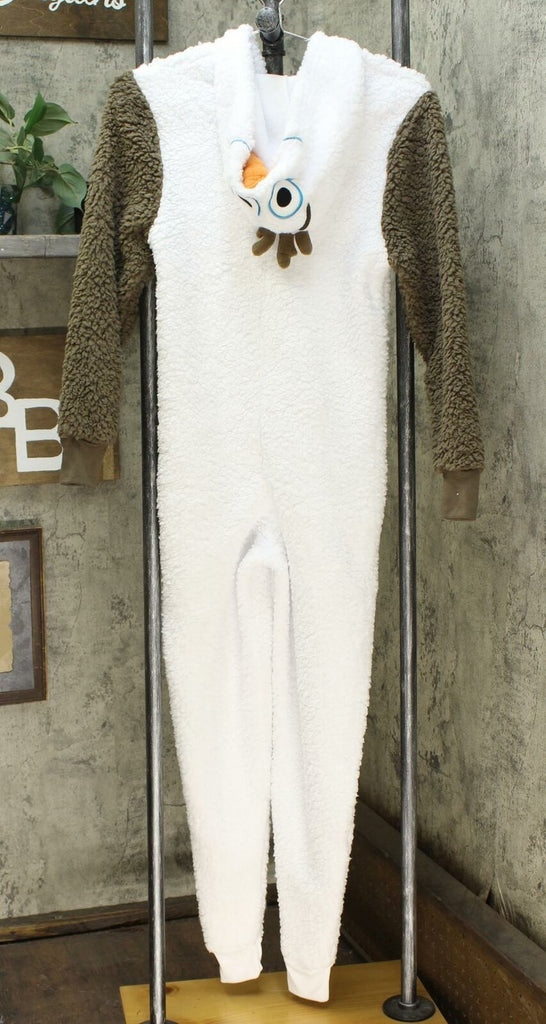 Whether you're cuddled up in front of the fire or hosting a Disney movie marathon, channel a happy-go-lucky vibe with this women's Olaf Union Suit from Frozen. Designed to imitate the beloved snowman from the Disney movie, this women's long-sleeve union suit features a white exterior, fuzzy brown arms, printed black "buttons" on the torso and realistic face detailing on the hood including a cute carrot nose helping you look just like Olaf. The long sleeves help you stay cozy and warm during the winter months, and the zip-up front makes for easy wear and layering, making this union suit a convenient go-to with playful flair to match.