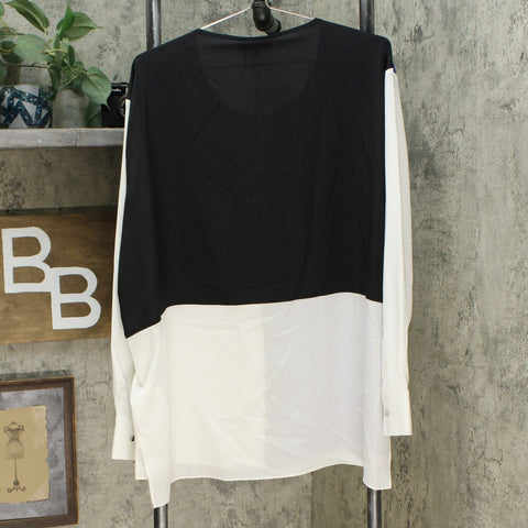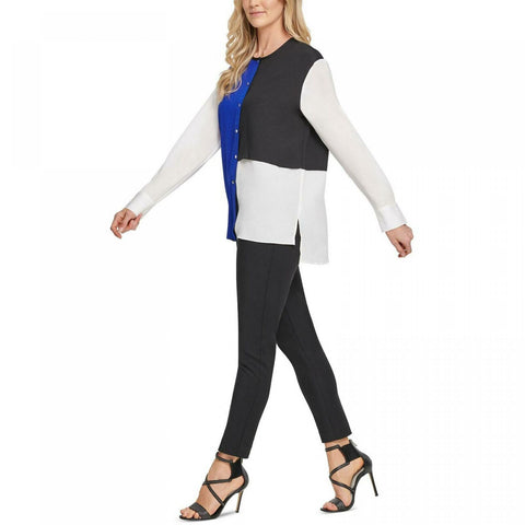 Bold colorblocking gives a graphic upgrade to the slightly oversized shape of DKNY's button-up top in fluid crepe de chine.