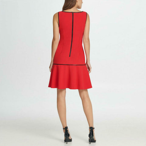 Hit the town in this updated sheath from DKNY, featuring a flounce hem and faux-leather piping.