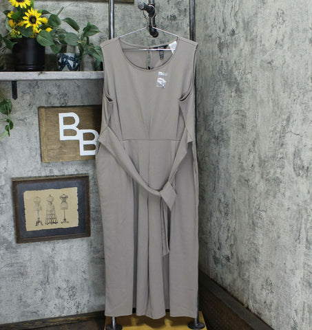 Features: tie waist, round neckline, sleeveless, pleating detail, angled pockets, cropped length, waist seam, keyhole back with button closure