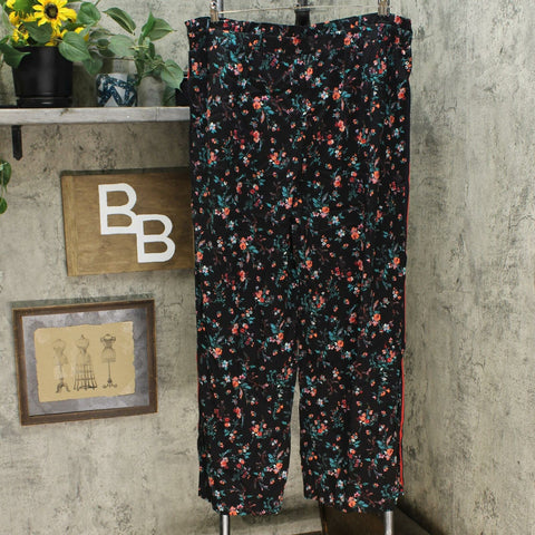 Features: full-length style, floral print, side-seam track stripe trim, pull-on style, elastic waistband with ruffle detail