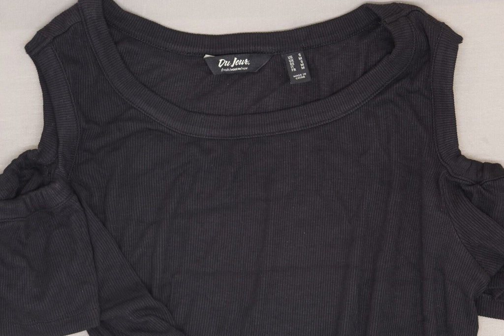 Features: scoop neckline, cold shoulder with lightweight elastic, short sleeves, straight hem