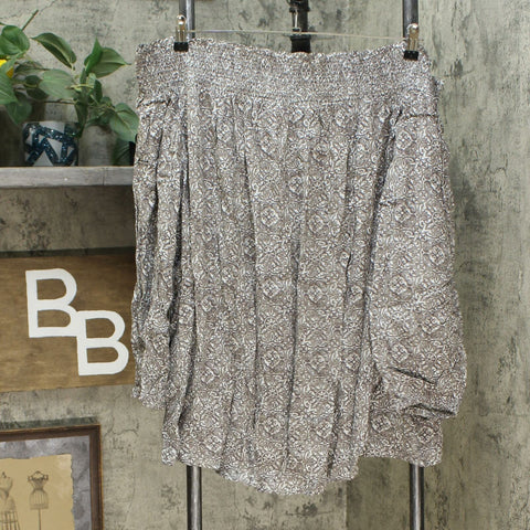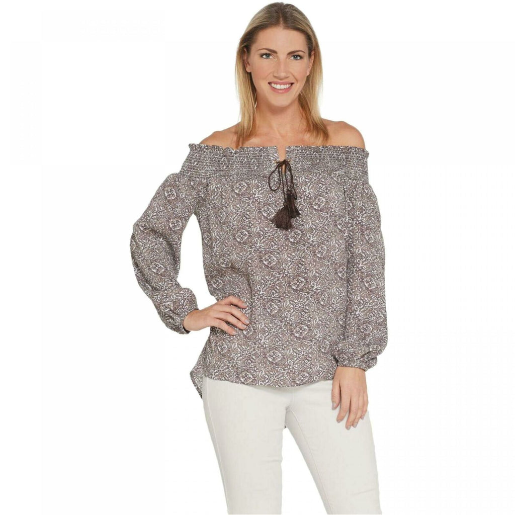 Features: smocked off-the-shoulder neckline with elastic inset, tie closure with tassels at the neck, 3/4-length sleeves, elastic at the bottom of sleeves