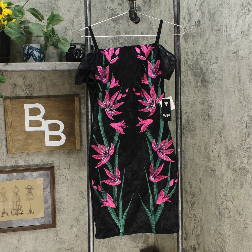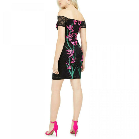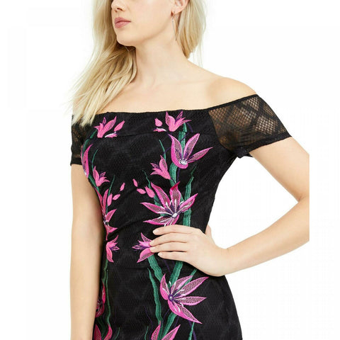 GUESS' night-out dress heats things up with revealed shoulders and bright tropical embroidery.