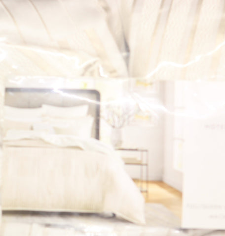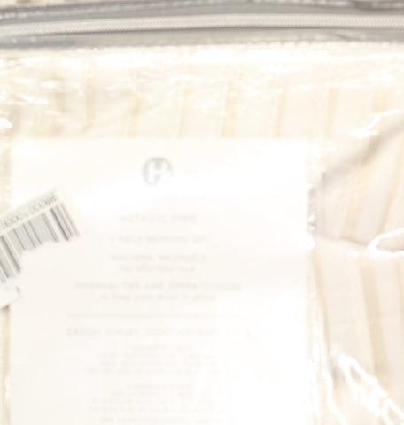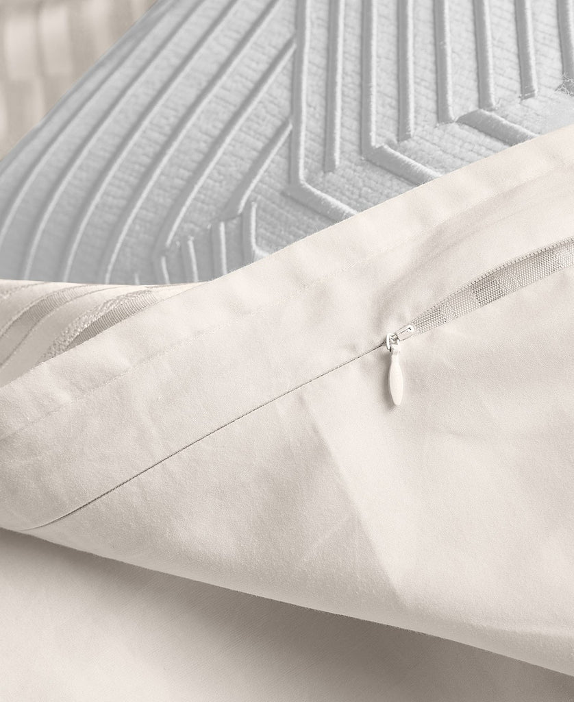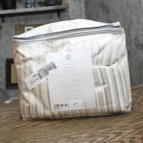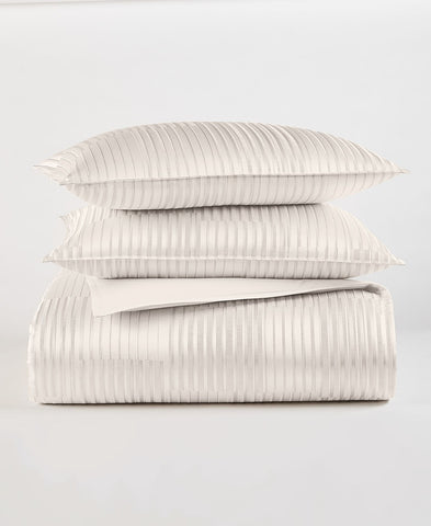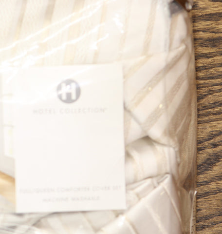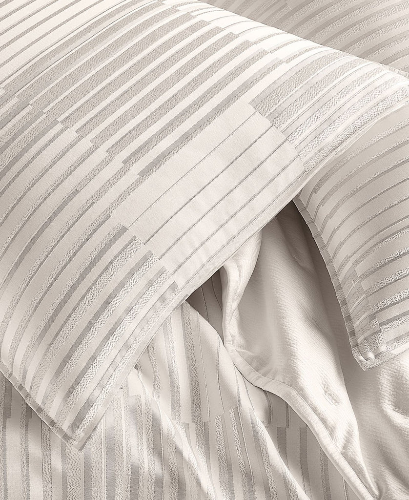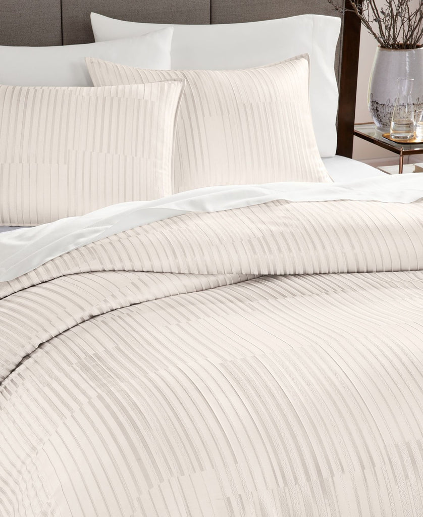 With a hint of metallic shine and a super smooth satin hand, the Metallic Strie duvet cover set from Hotel Collection features a refined take on stripes atop an ivory ground. Features Product dimensions: Duvet cover: 94" x 96", Standard shams: 20" x 28" Set includes: 1 duver cover, 2 standard shams Internal ties and zipper closure Front: 95% polyester, 5% metallic; reverse: 60% cotton, 40% polyester Machine wash Imported