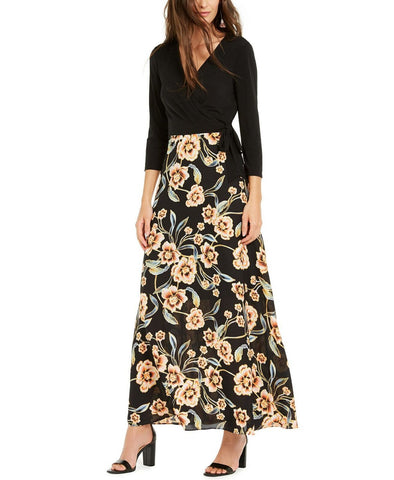 A floral skirt and a surplice bodice create a classic, flattering feel on this surplice maxi dress from INC International Concepts.