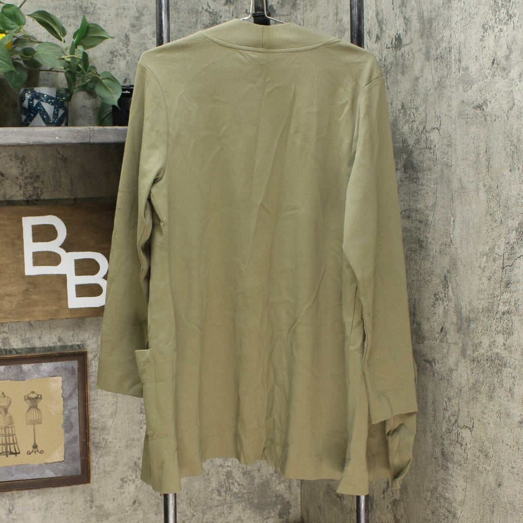 Features: open front placket with wide inset, long sleeves, two front patch pockets, side slits