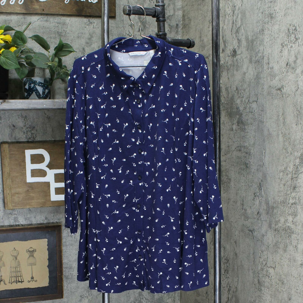 Features: ditsy floral print, button-front closure, convertible point collar, 3/4-length sleeves, front and back princess seams, curved hem