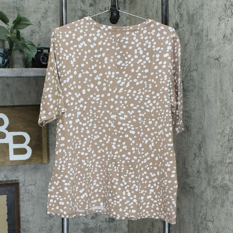 Features: appaloosa dot print, crew neckline, elbow-length sleeves, center back body seam, straight bottom hem
