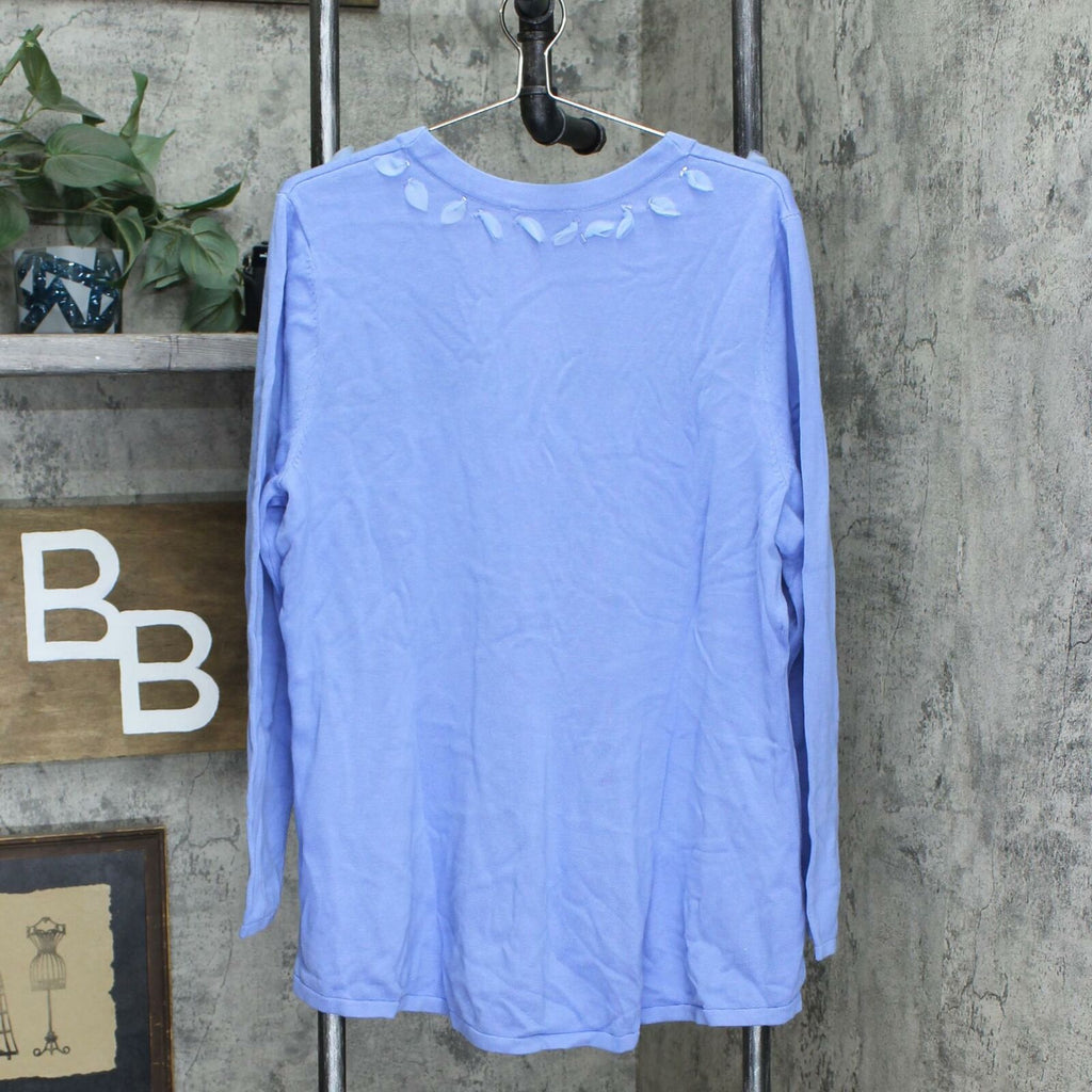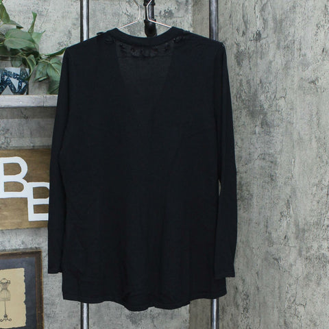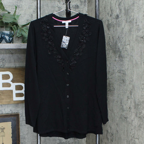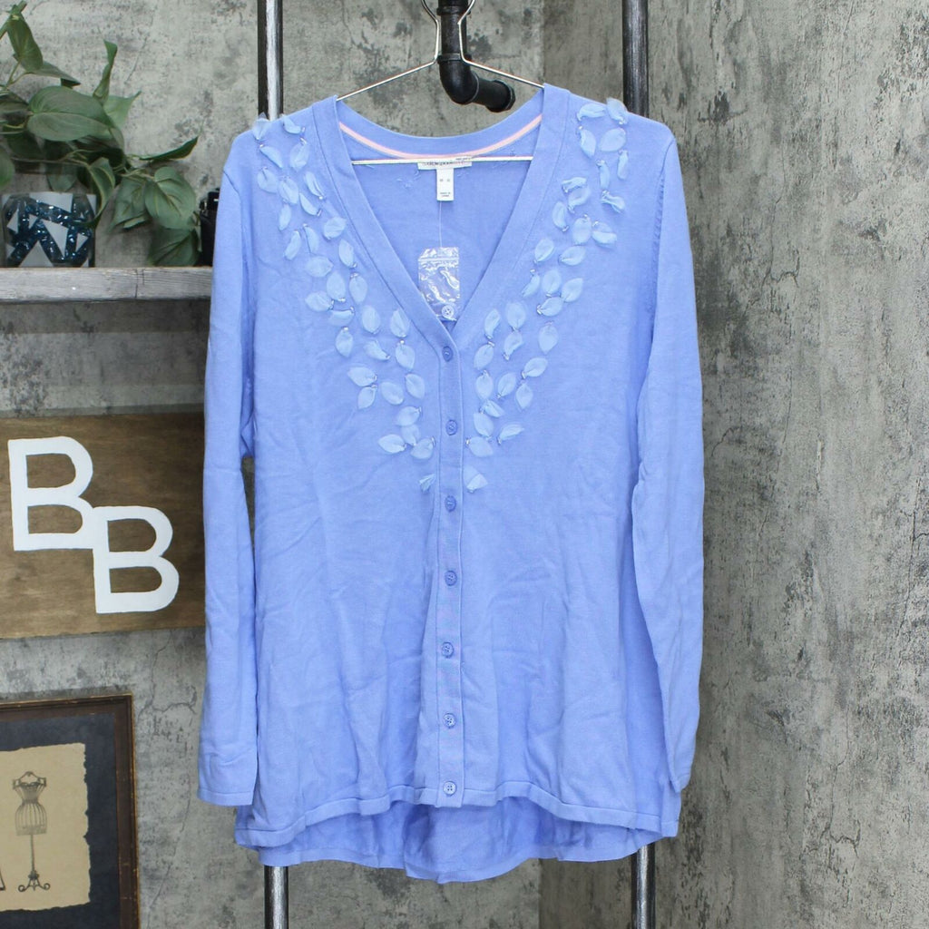 Cardi candy! It's all smiles when you sport this waist-flattering peplum sweater with a sprinkling of sweet embellishment.