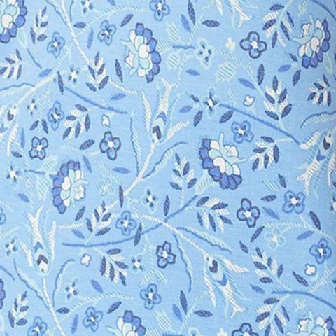 Features: allover floral print, crew neck and rolled short sleeves with striped insets, side slits, straight bottom hem