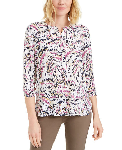 JM Collection provides feminine finesse with this pleated blouse, featuring 3/4-blouson-sleeves.