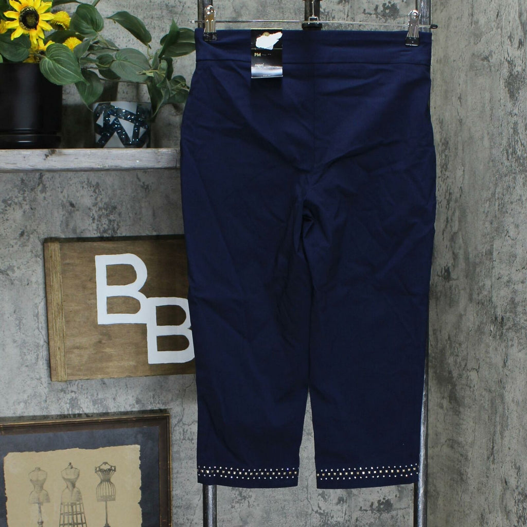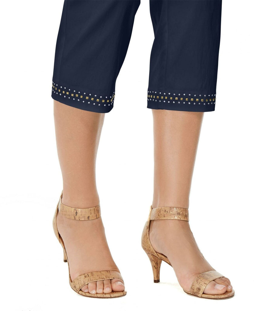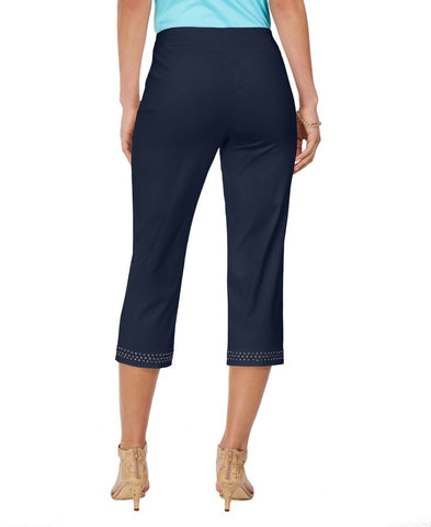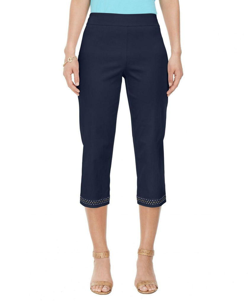 A tummy-control panel at front and comfort waistband provide all-day comfort while an embellished hem add contemporary flair to these traditional capri pants from JM Collection.