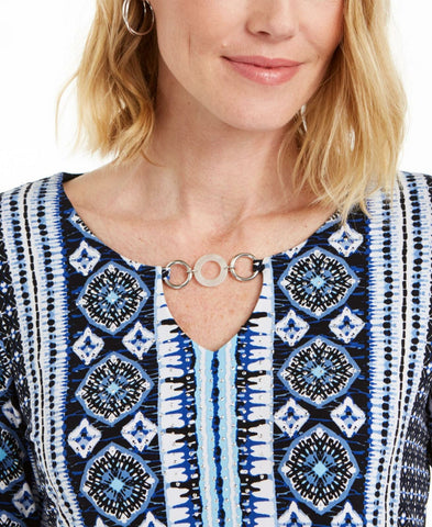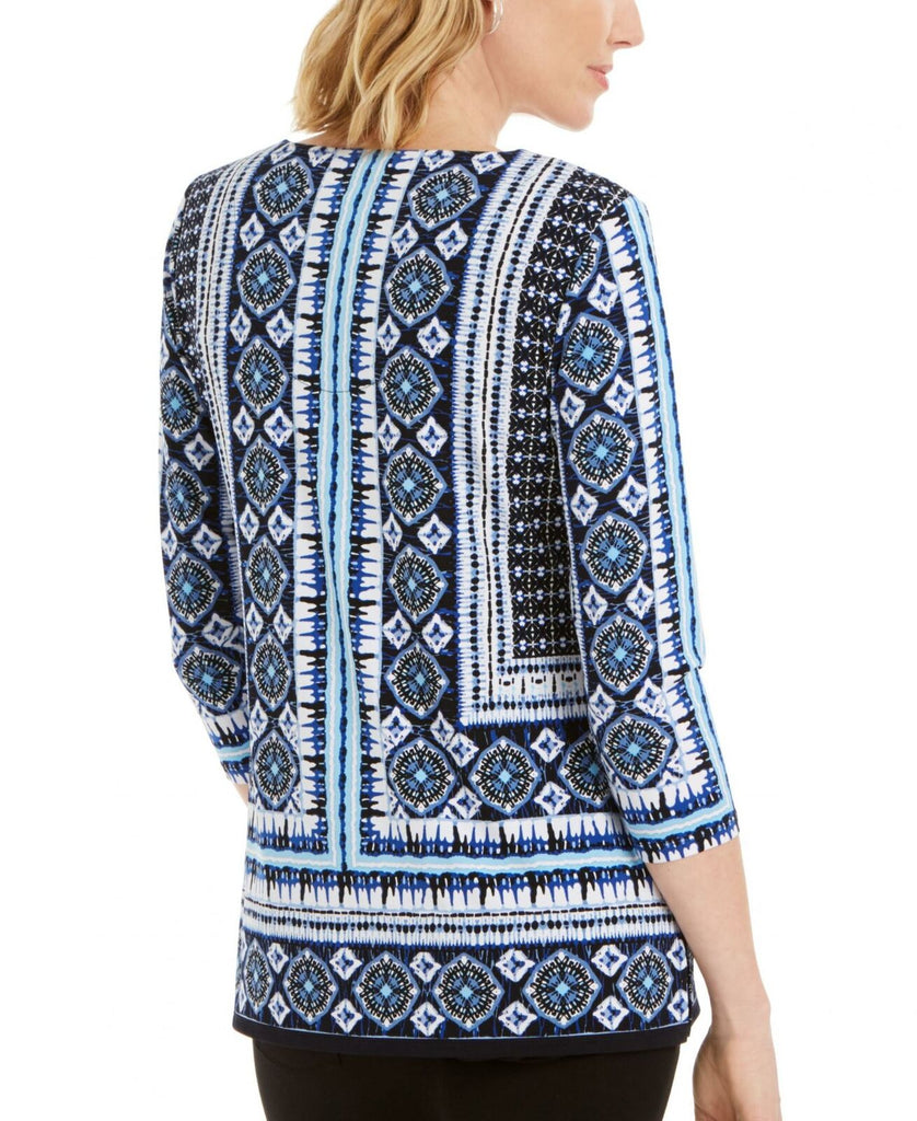 JM Collection pulls out all the stops with this prints-on-prints top. Geometric shapes, colorful lines and a little imitation-pearl trim combine on this eye-catching look.