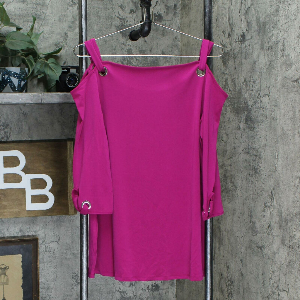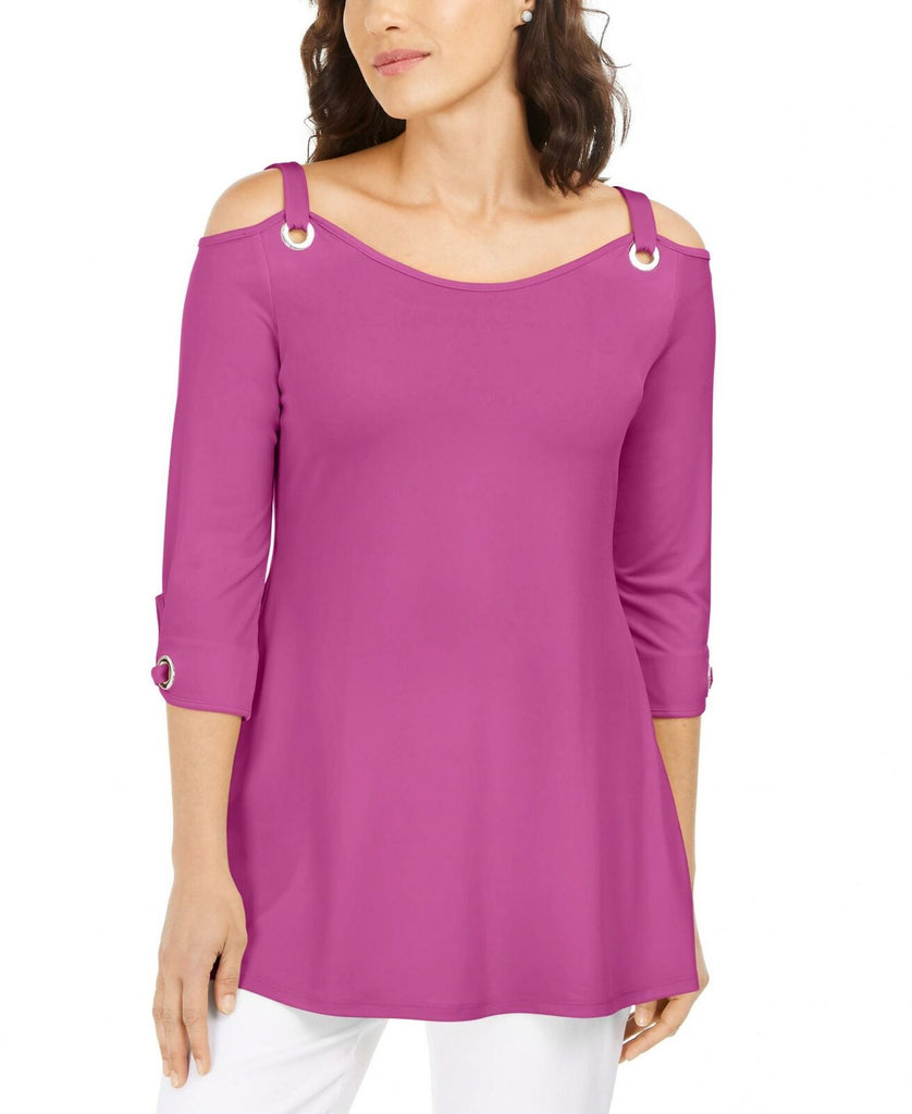 Shimmery grommet embellishments highlight the cold-shoulder cutouts and cuffs on this petite JM Collection top.