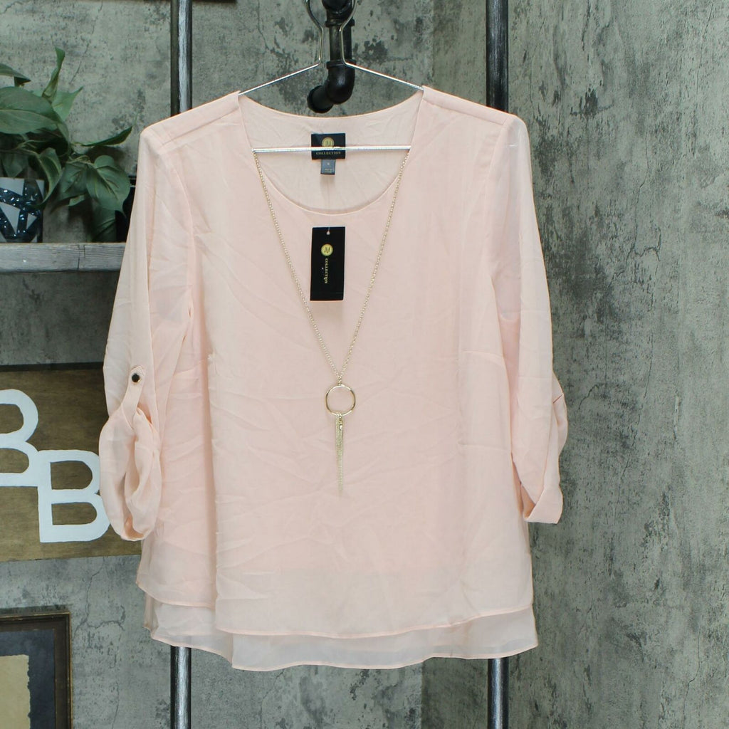 Coordinated with a chic attached necklace, this JM Collection top features roll-tab sleeves for flair and stylish versatility.