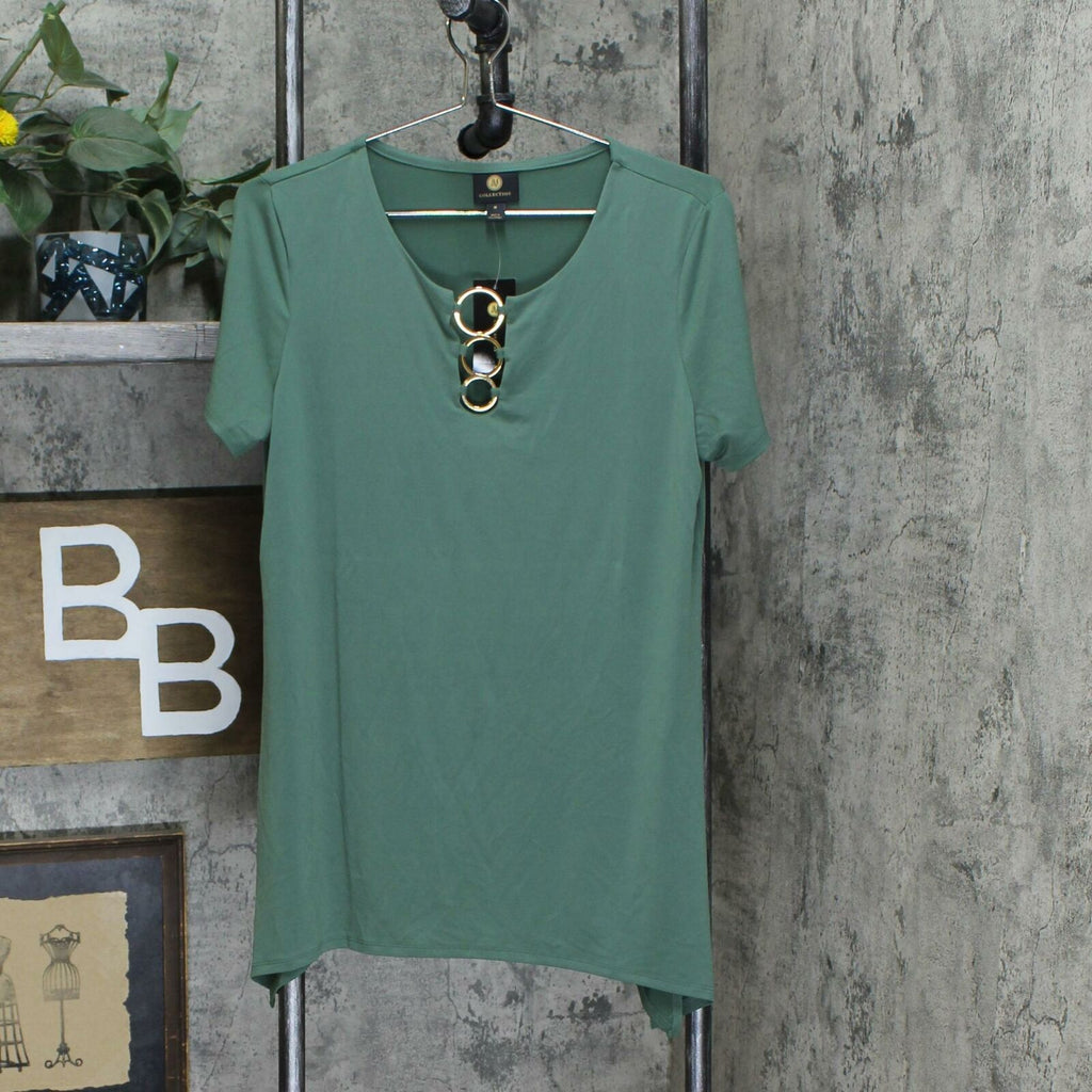 A stylish look is effortless with this JM Collection top, a versatile solid-color piece punctuated with three rings at the neckline.