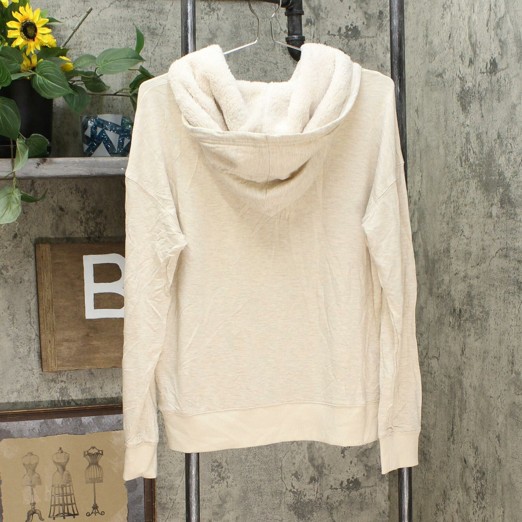 Add some festive flair to your cool-weather wardrobe without going over the top with the Long-Sleeve Santa Baby Sherpa Hoodie from Knox Rose. This women's hooded sweatshirt makes a cozy addition to your casualwear with a soft sherpa lining, and a message of "Santa Baby" written across the front gives it a seasonal vibe you'll love. Rather than playing up vibrant holiday colors, this sherpa-lined hoodie comes in a simple cream hue, with the message spelled out in cream-colored rhinestones for a toned-down look. Whether you pair it with jeans for running errands or grabbing coffee with a friend, or with thermal leggings and slippers for a movie marathon, this women's holiday sweatshirt is sure to be a favorite throughout the season.