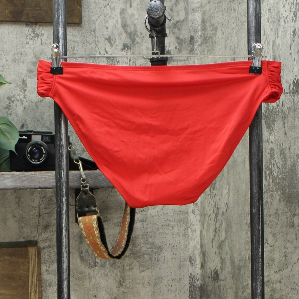 Bring a bright splash of color to your swimwear with the Medium Coverage Tab Side Hipster Bikini Bottom from Kona Sol. This women's bikini bottom pops in a vibrant shade of red that's sure to help you stand out during your next beach or pool day. Pair with the matching top for a fiery coordinated look, or pair with a black and white top for extra interest. However you style the red swim bottom, you'll appreciate the full lining that allows for confident wear, as well as the shirring at the sides that adds a little extra detail to the solid-colored bottoms.