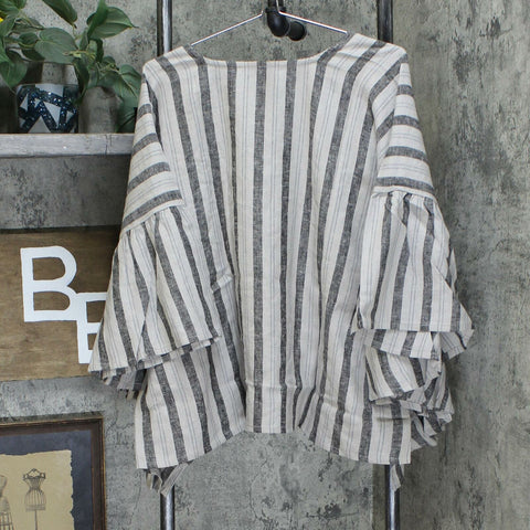Features: yarn-dyed stripe, kimono style, open front, tapered shape, ruffled flutter sleeves, straight bottom hem