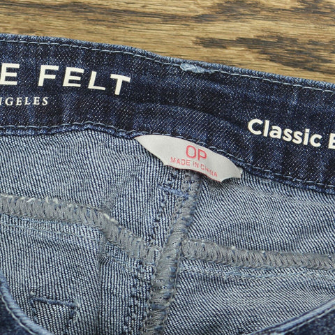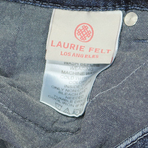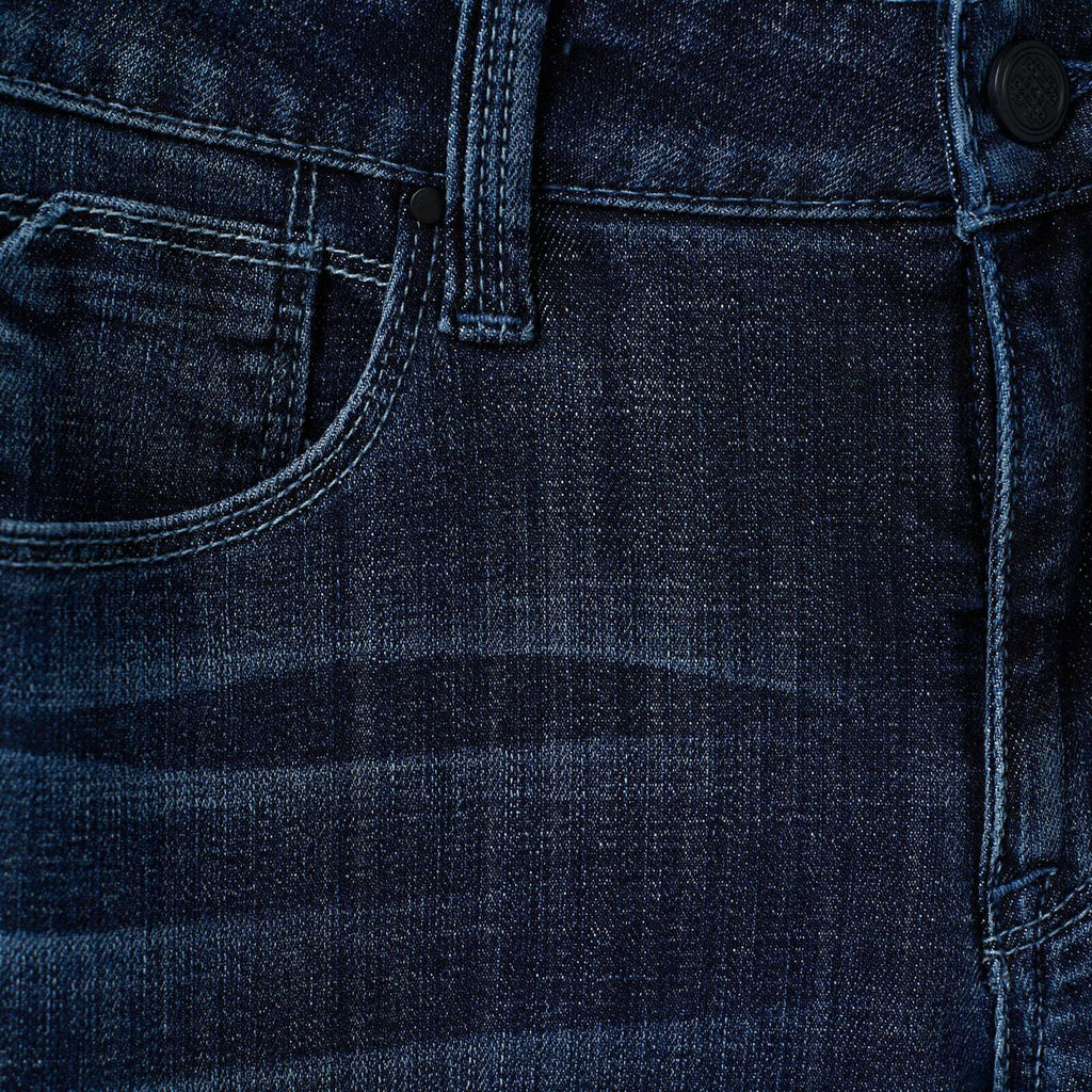 Brushed Indigo: whiskering detail on thighs, matte black hardware