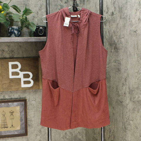 Features: open front; top half of vest is French terry, below waist is faux-suede; drawstring hood; side pockets.