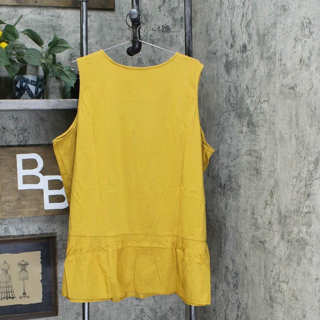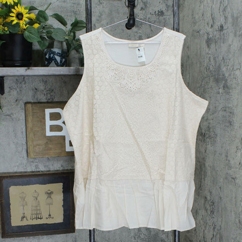 Features: scoop neckline, lace front, sleeveless, front and back ruffle trim at hemline