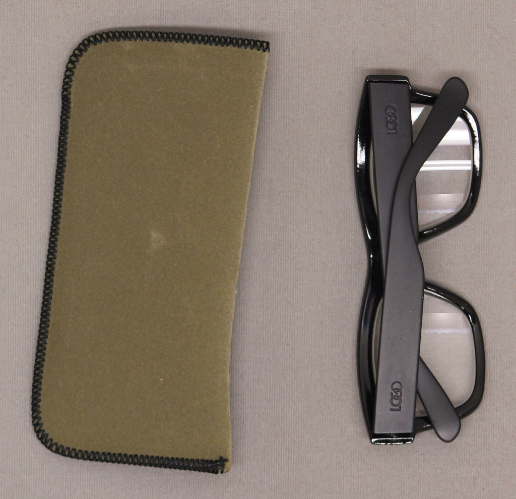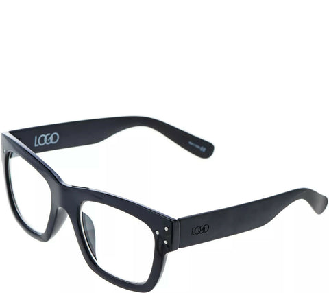 Features: squared signature frames with design detail; LOGO imprint on outside of both temples; LOGO imprint on inside right temple; lenses progress from full magnification to zero magnification