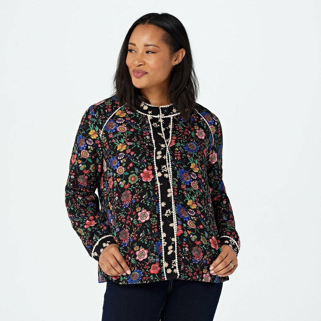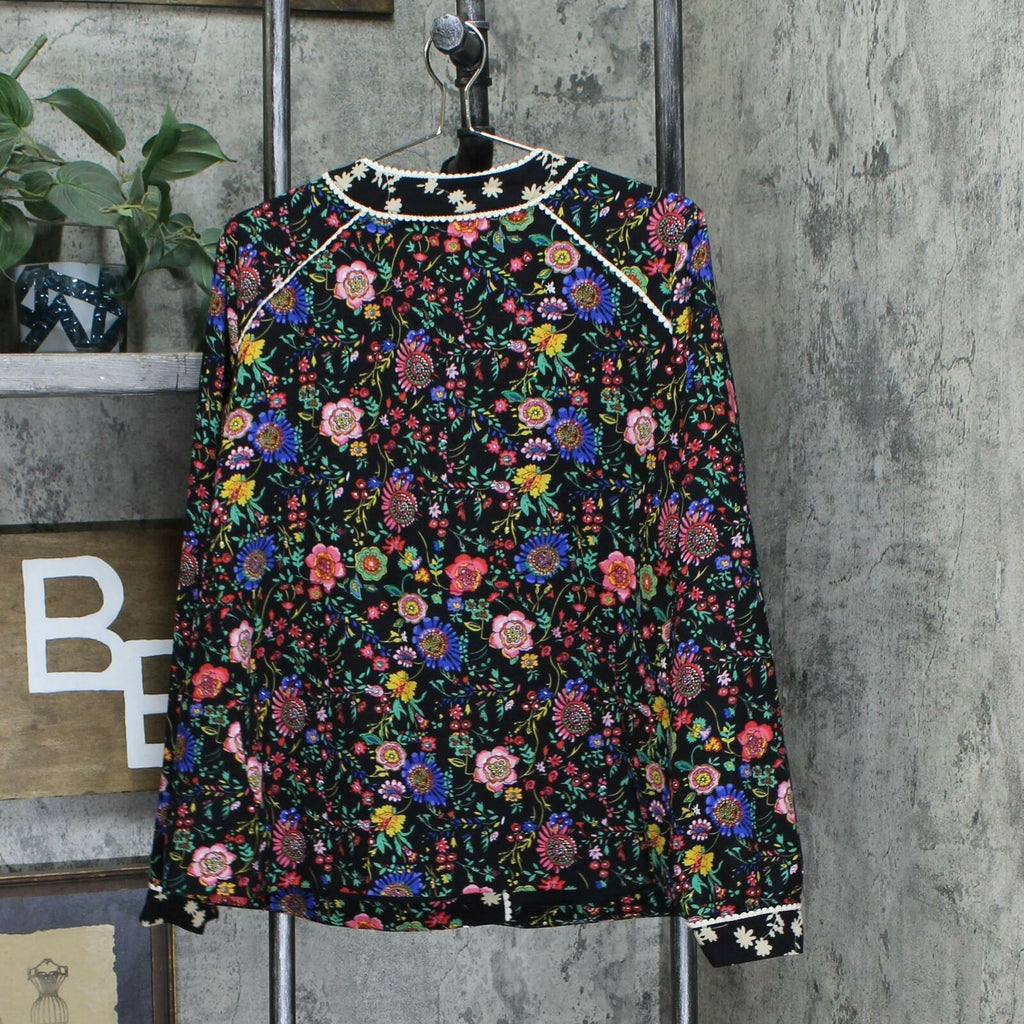 Features: allover mixed print, crew neck, long sleeves, crochet trim details, straight bottom hem, on-seam pockets
