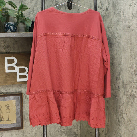 Features: cotton embroidery detail, shoulder pleat detail, button-front closure, 3/4-length sleeves, eyelet bottom hem