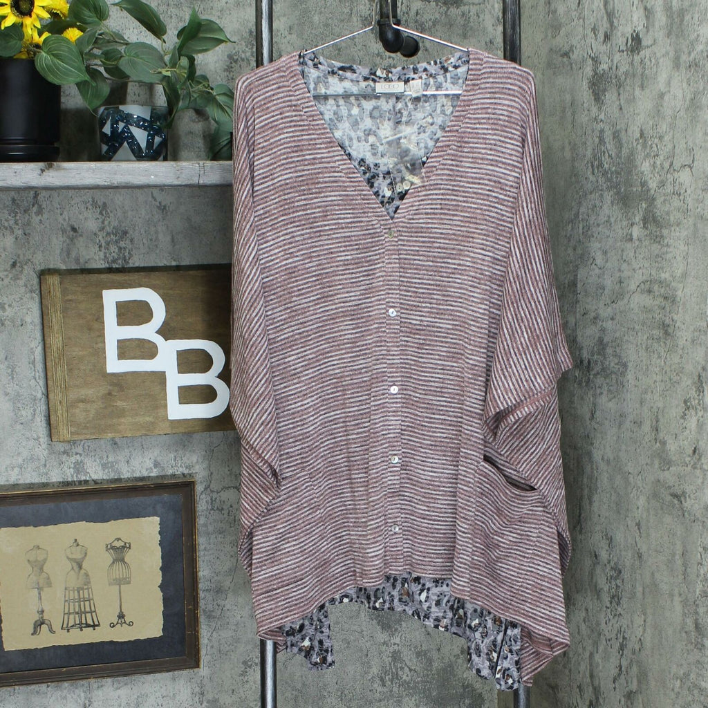 Shrug Features: allover print, button front closure, two front patch pockets