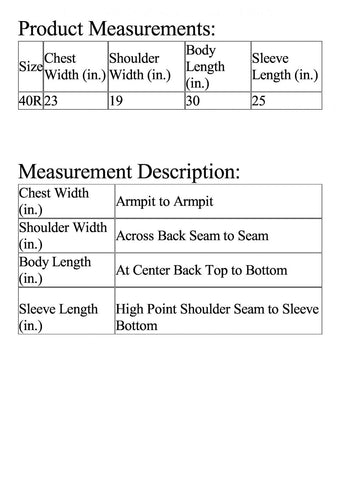 Jacket sizing is indicated by a number and a letter; Number refers to chest size, Letter refers to length of Jacket based upon height: S=5'7" and under; R=5'8"-5'11"; L=6' and up