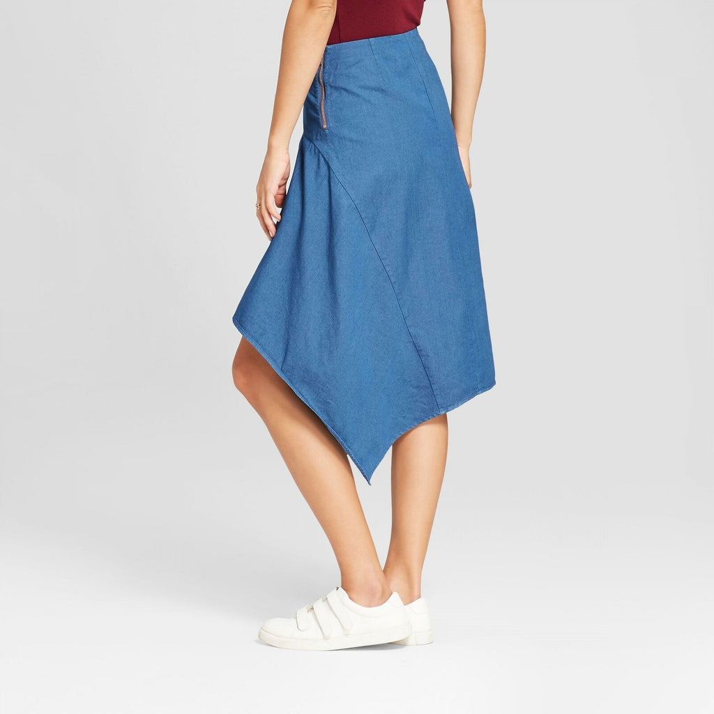 Bring versatile style to your wardrobe with the Asymmetrical Denim Skirt from Mossimo. In a medium blue, this asymmetrical midi skirt features darting along the back hemline for a flattering fit, and the side zipper creates a clean, polished finish. Pair with a floral blouse and wedge heels for feminine flair, or wear with a graphic tee and canvas sneakers for a laid-back look.