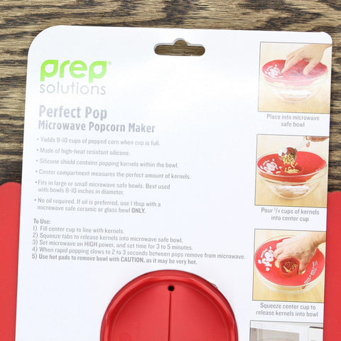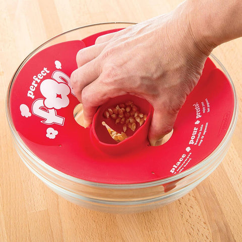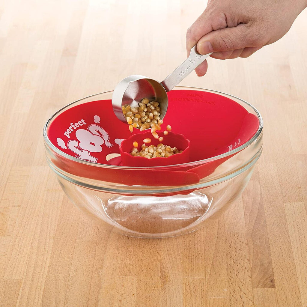 The Prep Solutions MiracleWare by Progressive Microwave Perfect Pop! Popcorn Maker works with multiple sizes of your microwave safe bowls. The unique kernel measuring design in the center quickly measures and acts as a lid to contain popcorn as it pops. Just fill up the center cup, pinch and release kernels into the bowl. It pops 4-6 cups of popped corn. It is dishwasher safe and microwave safe.