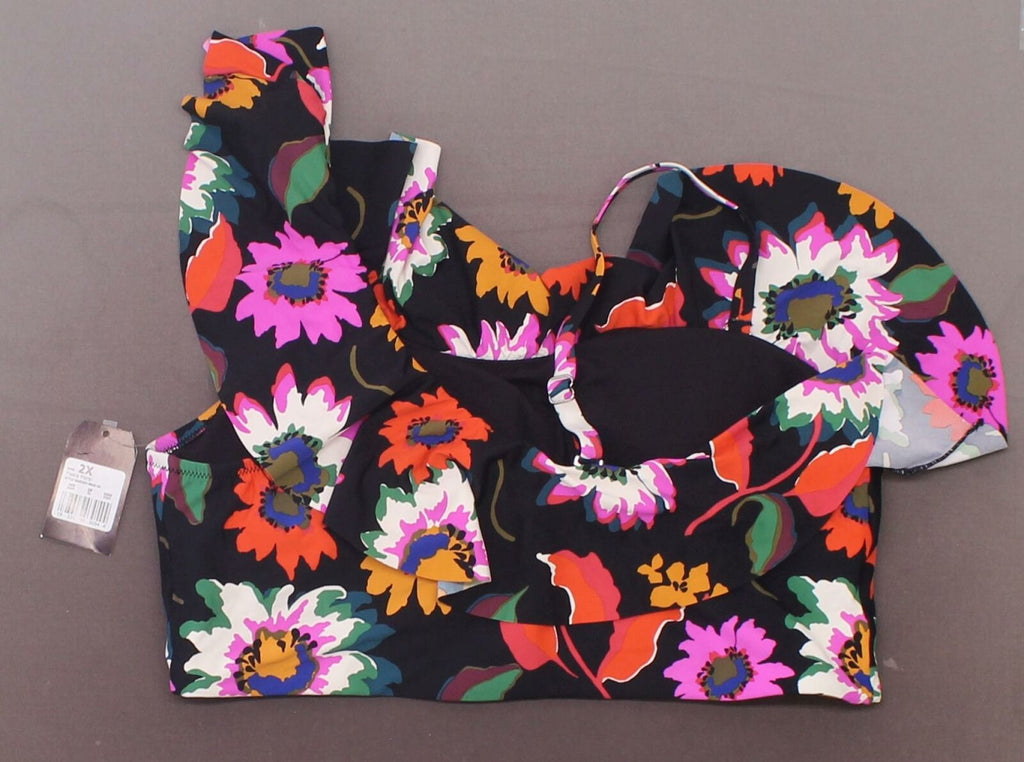 Freshen up your swim look with the Asymmetrical Ruffle Bikini Top from Sea Angel. This printed swim top showcases vibrant florals popping out from the lovely black background for a darling look you'll love to show off while its soft fabric with added spandex lets you move in and out of the water in flexible comfort. The pullover swim top comes styled with a one-shoulder silhouette that's accented with a ruffle.